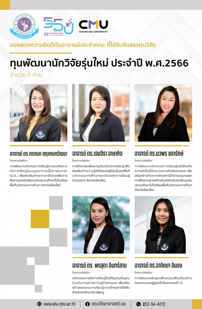 ผลการจัดสรรทุนพัฒนานักวิจัยรุ่นใหม่ ประจำปี พ.ศ.2566 โดยมีรายชื่อคณาจารย์ คณะศึกษาศาสตร์ มหาวิทยาลัยเชียงใหม่ จำนวน 5 ท่าน