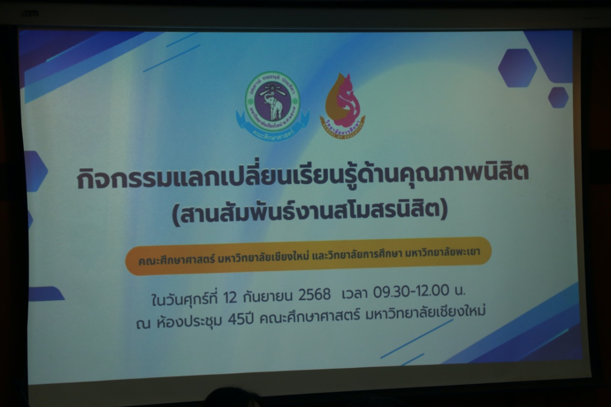 เมื่อวันศุกร์ที่ 12 กันยายน 2568 คณะศึกษาศาสตร์ มหาวิทยาลัยเชียงใหม่ นำโดย ผู้ช่วยศาสตราจารย์ ดร.อุไรวรรณ หาญวงค์ รองคณบดี และ ผู้ช่วยศาสตราจารย์ ดร.สุทธิกัญจน์ ทิพยเกษร ผู้ช่วยคณบดี พร้อมด้วยนายกและคณะกรรมการสโมสรนักศึกษาคณะศึกษาศาสตร์ ประจำปีการศึกษา 2568 ให้การต้อนรับคณะผู้บริหาร คณาจารย์ และนักศึกษาจากสโมสรนิสิต จากวิทยาลัยการศึกษา มหาวิทยาลัยพะเยา จำนวน 25 คน นำโดย ผู้ช่วยศาสตราจารย์ ดร.ณัฐวุฒิ สัพโส ผู้ช่วยคณบดี เข้าศึกษาดูงานและแลกเปลี่ยนเรียนรู้ด้านคุณภาพนิสิต โดยมุ่งเน้นที่การสานสัมพันธ์และพัฒนาอัตลักษณ์ของนิสิตผ่านการจัดกิจกรรมของงานสโมสรนักศึกษา ณ ห้องประชุม 45 ปี อาคาร 4 คณะศึกษาศาสตร์ มหาวิทยาลัยเชียงใหม่