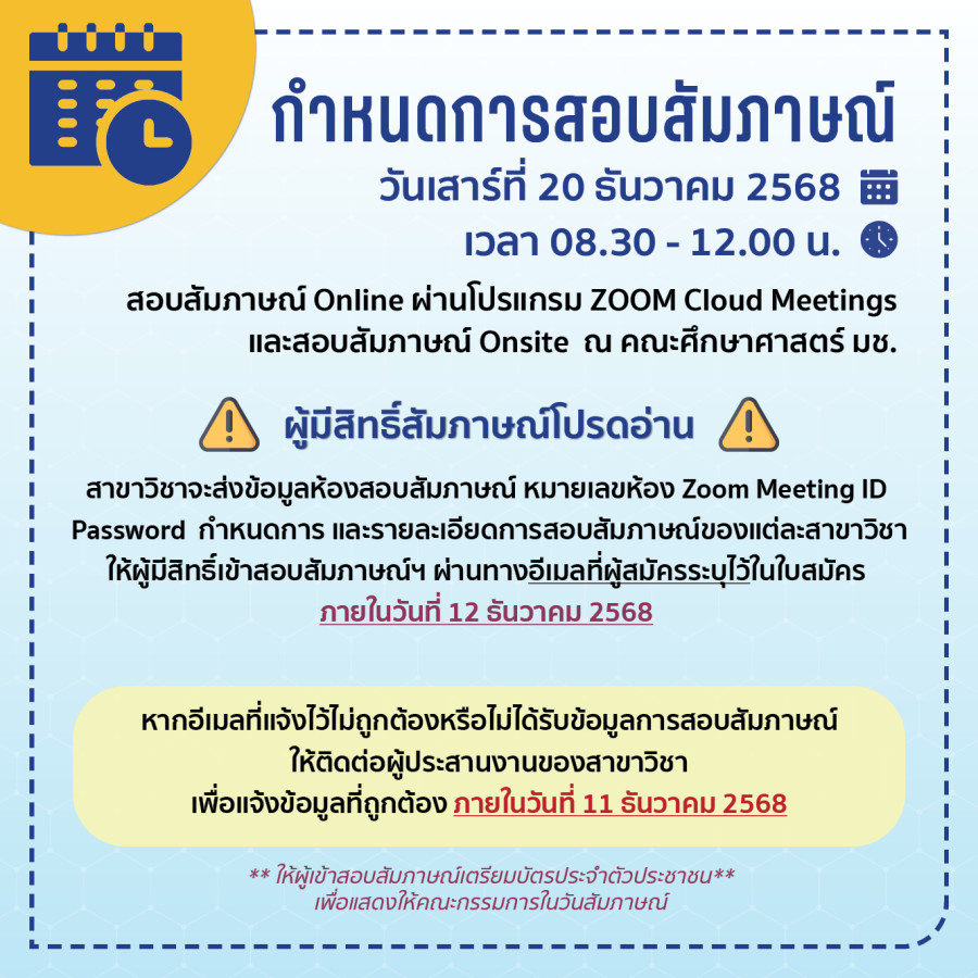 สอบสัมภาษณ์ Online ผ่านโปรแกรม ZOOM Cloud Meetings และสอบสัมภาษณ์ Onsite ณ คณะศึกษาศาสตร์ มช.
