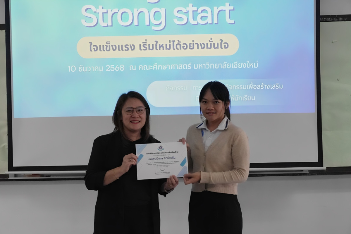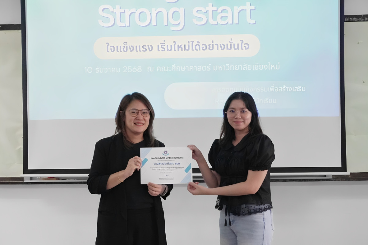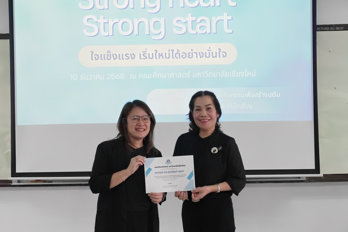 คณะศึกษาศาสตร์ มหาวิทยาลัยเชียงใหม่ จัดกิจกรรม STRONG HEART STRONG START – ใจแข็งแรง เริ่มใหม่ได้อย่างมั่นใจ เมื่อวันที่ 10 ธันวาคม 2568 โดยได้รับเกียรติจาก ผู้ช่วยศาสตราจารย์ ดร.พิมพ์พธู สุตานันต์ ผู้ช่วยคณบดี กล่าวเปิดงานและต้อนรับผู้เข้าร่วมกิจกรรม โดยกิจกรรมครั้งนี้จัดขึ้นเพื่อพัฒนาศักยภาพครูและบุคลากรทางการศึกษาในการออกแบบกิจกรรมเสริม Resilience ให้แก่นักเรียน โดยมีทีมวิทยากรผู้เชี่ยวชาญ ได้แก่ อาจารย์ ดร.นันทกา สุปรียาพร, รองศาสตราจารย์ ดร.นงลักษณ์ เขียนงาม, อาจารย์ ดร.ปองสุข ศรีชัย และ อาจารย์ ดร.รจนา บุญลพ พร้อมด้วย นักศึกษาปริญญาโท สาขาวิชาจิตวิทยาการศึกษาและการแนะแนว ร่วมเป็นผู้ช่วยดำเนินกิจกรรม มีผู้เข้าร่วมทั้งหมด 20 คน ร่วมเรียนรู้เทคนิคการเสริมพลังใจ การเข้าใจผู้เรียน และการออกแบบกิจกรรมที่สามารถนำไปประยุกต์ใช้จริงในสถานศึกษา บรรยากาศการอบรมเป็นไปอย่างเข้มข้น อบอุ่น และเต็มไปด้วยการแลกเปลี่ยนประสบการณ์ ณ ห้อง 3315 อาคาร 3 คณะศึกษาศาสตร์ มหาวิทยาลัยเชียงใหม่