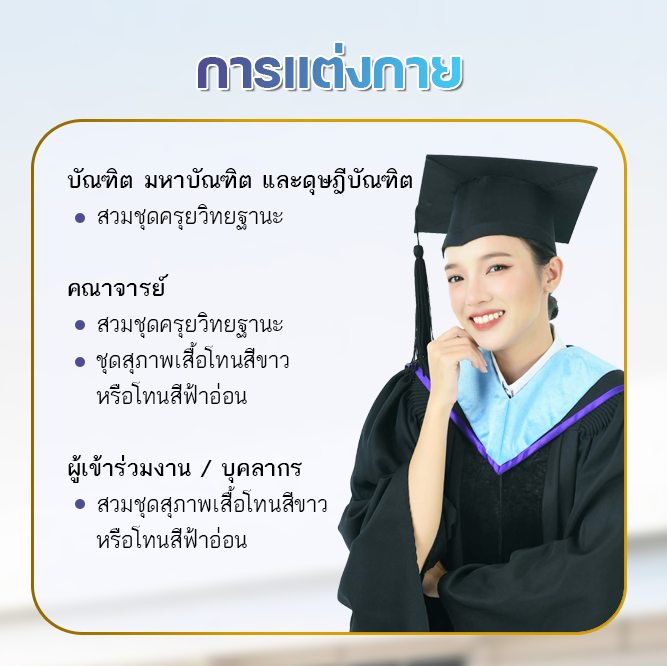 บัณฑิตโปรดมารายงานตัวตามเวลาที่กำหนด เพื่อความสะดวกในการจัดแถวเรียงลำดับความสูง และตรวจสอบความเรียบร้อยของเครื่องแต่งกายก่อนเริ่มการถ่ายภาพหมู่ และอย่าลืมนำหมวกมาด้วย