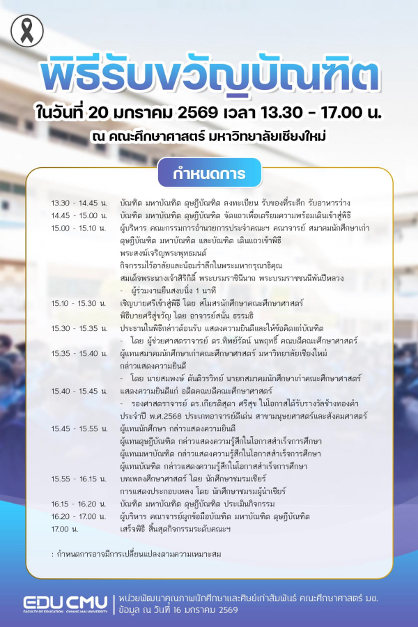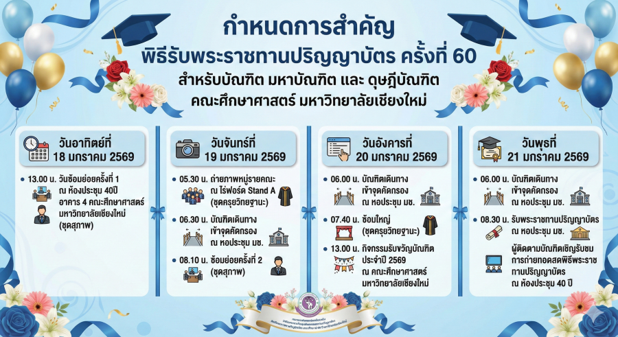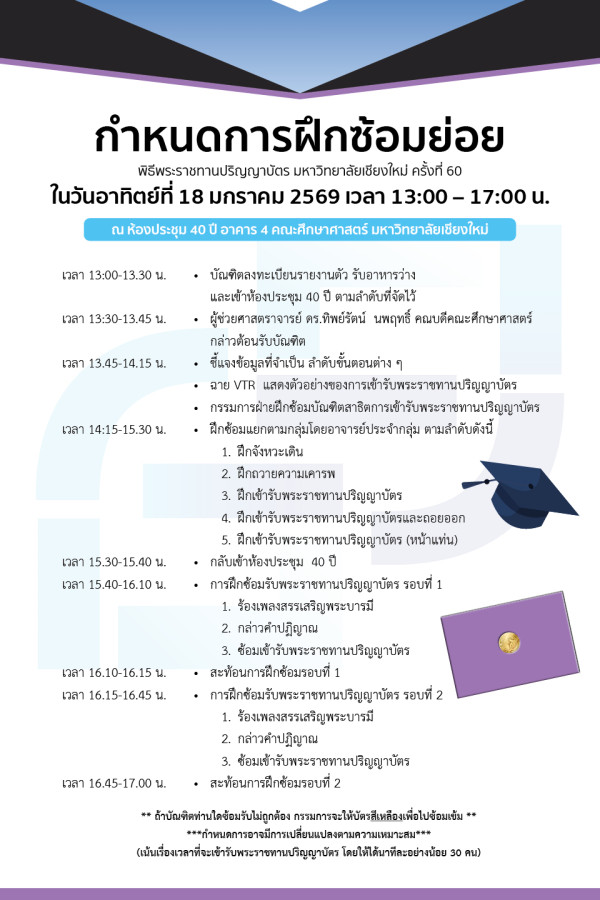 2. กำหนดการฝึกซ้อมพิธีรับพระราชทานปริญญาบัตร ครั้งที่ 60 ในวันอาทิตย์ที่ 18 มกราคม 2569 เวลา 13:00 – 17:00 น. ณ ห้องประชุม 40 ปี อาคาร 4 คณะศึกษาศาสตร์ มหาวิทยาลัยเชียงใหม่