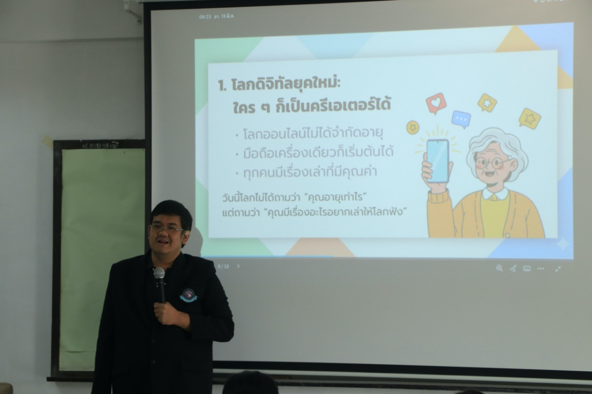 เมื่อวันอาทิตย์ที่ 15 มีนาคม 2569 ผู้ช่วยศาสตราจารย์ ดร. ณัฐพล แจ้งอักษร ผู้ช่วยคณบดี กล่าวทักทายและต้อนรับผู้เข้าร่วมการอบรมทั้ง 12 ท่าน ที่เข้าร่วมโครงการอบรมเชิงปฏิบัติการหลักสูตร “ครีเอเตอร์มือใหม่ สูงวัยวัยอินเทรนด์” ซึ่งเป็นหลักสูตรที่ออกแบบมาเพื่อกลุ่มผู้ที่มีอายุ 45 ปีขึ้นไปโดยเฉพาะ จัดโดยหน่วยบริการวิชาการ ณ ห้อง EB3315 อาคาร 3 ชั้น 3 คณะศึกษาศาสตร์ มหาวิทยาลัยเชียงใหม่